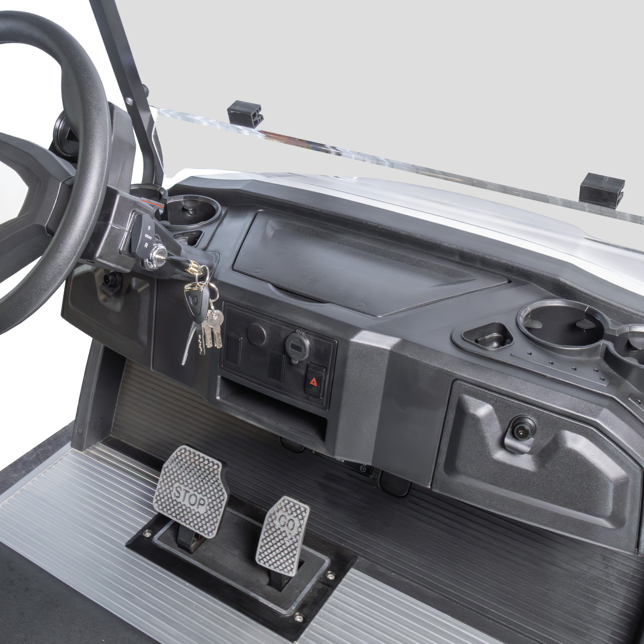 Front Shield and Wiper: Safety Folding Acrylic Windshield – Suited for golf course use