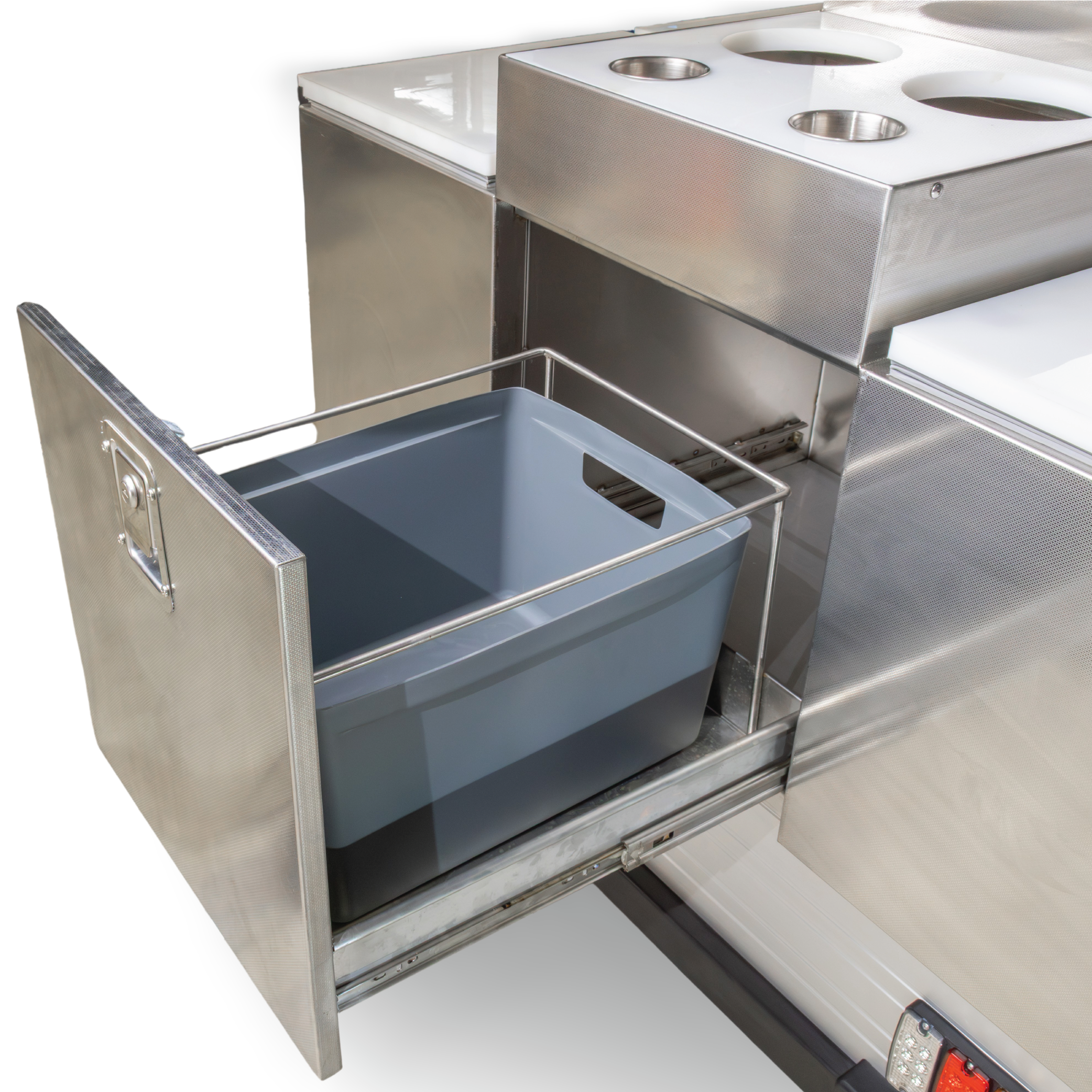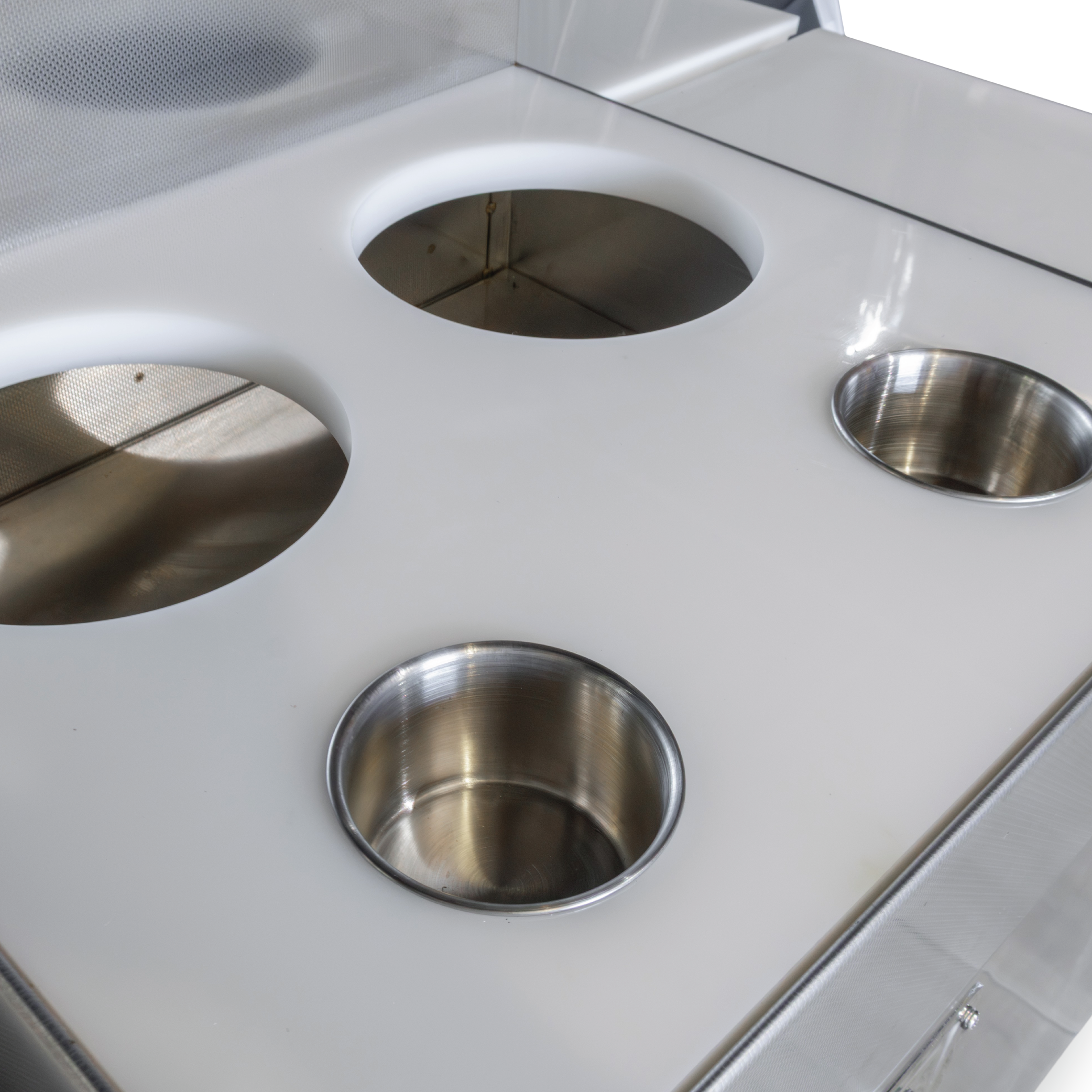 • Catering Cabinet: Quality food safe stainless steel. Each Drinks bay has a drain plug for easy washout and is designed for storing ice. The top cabinet displays food in a professional yet secure way.