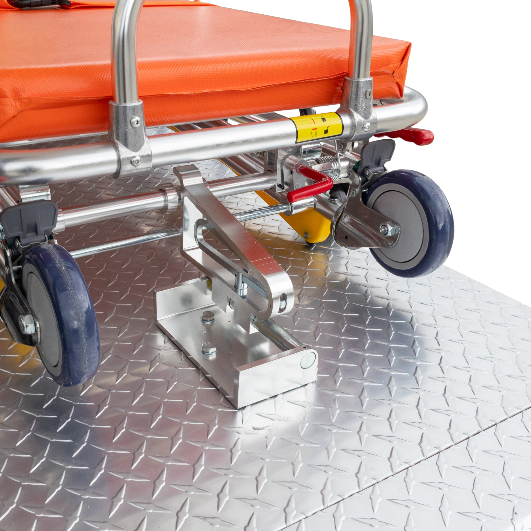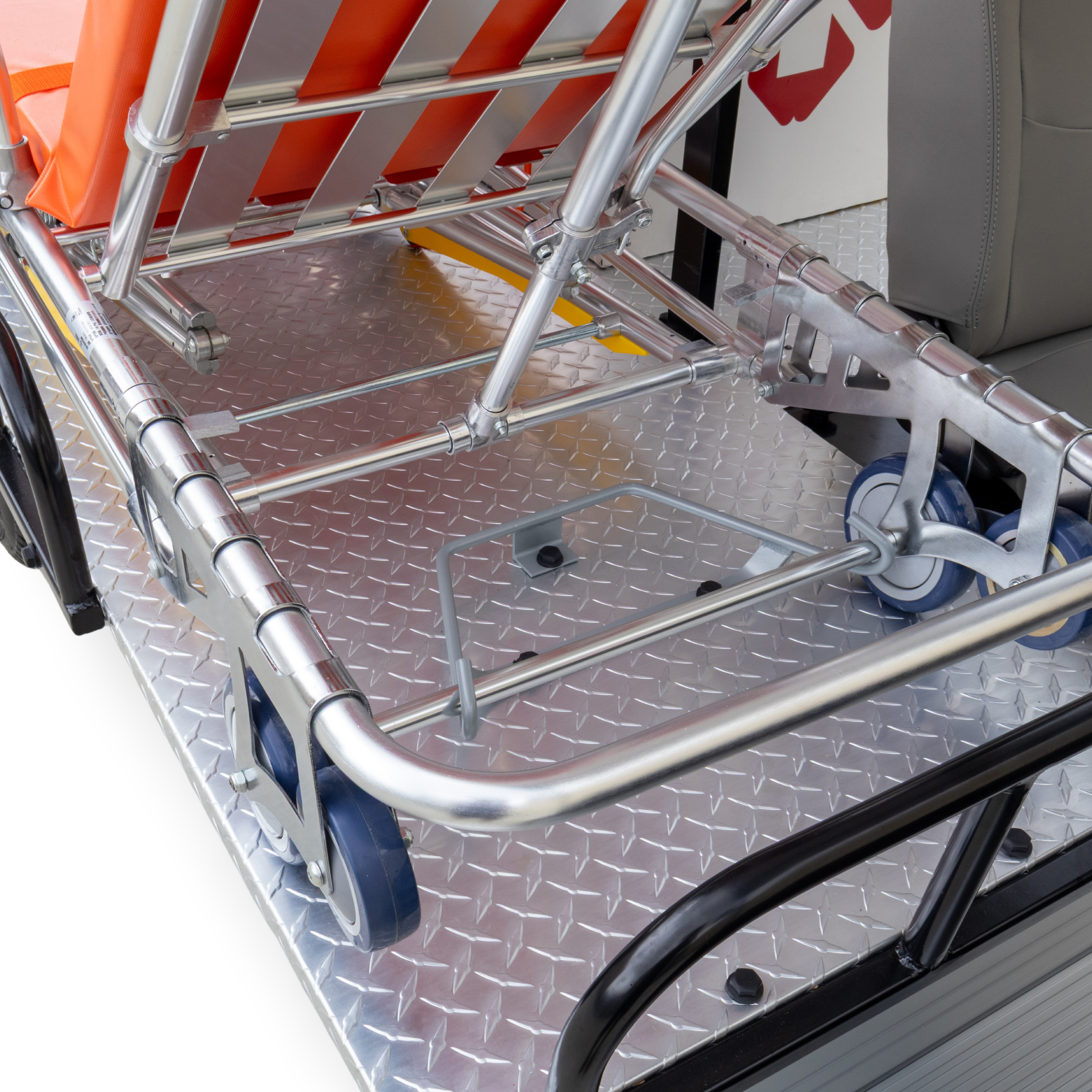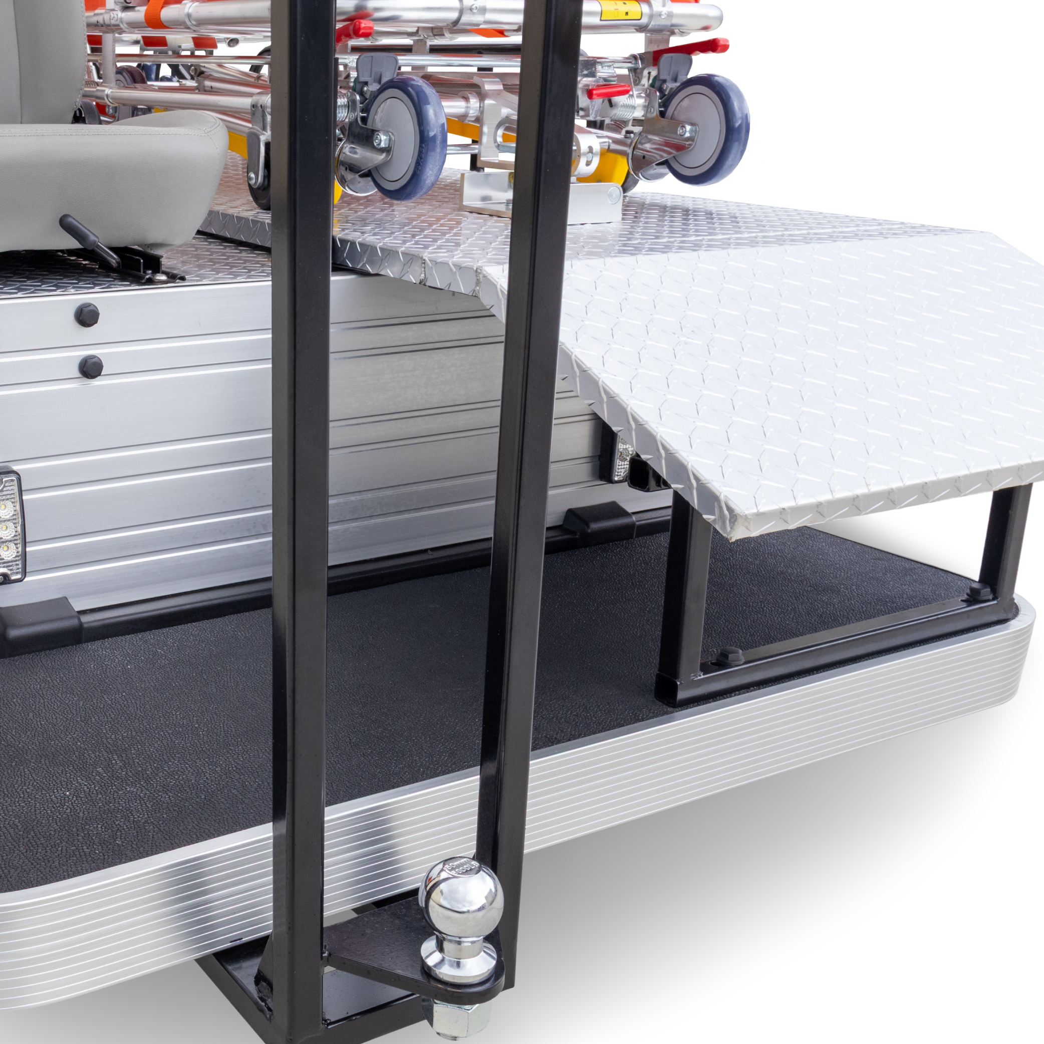- Stretcher Bed & Platform: Fit with a collapsible aluminium high-strength frame (up to 159kg capacity) with a high-density upholstered cushion that is water-resistant for easy cleaning. The platform is a checkerplate base with bed locking brackets and fold-down side restraint rail.